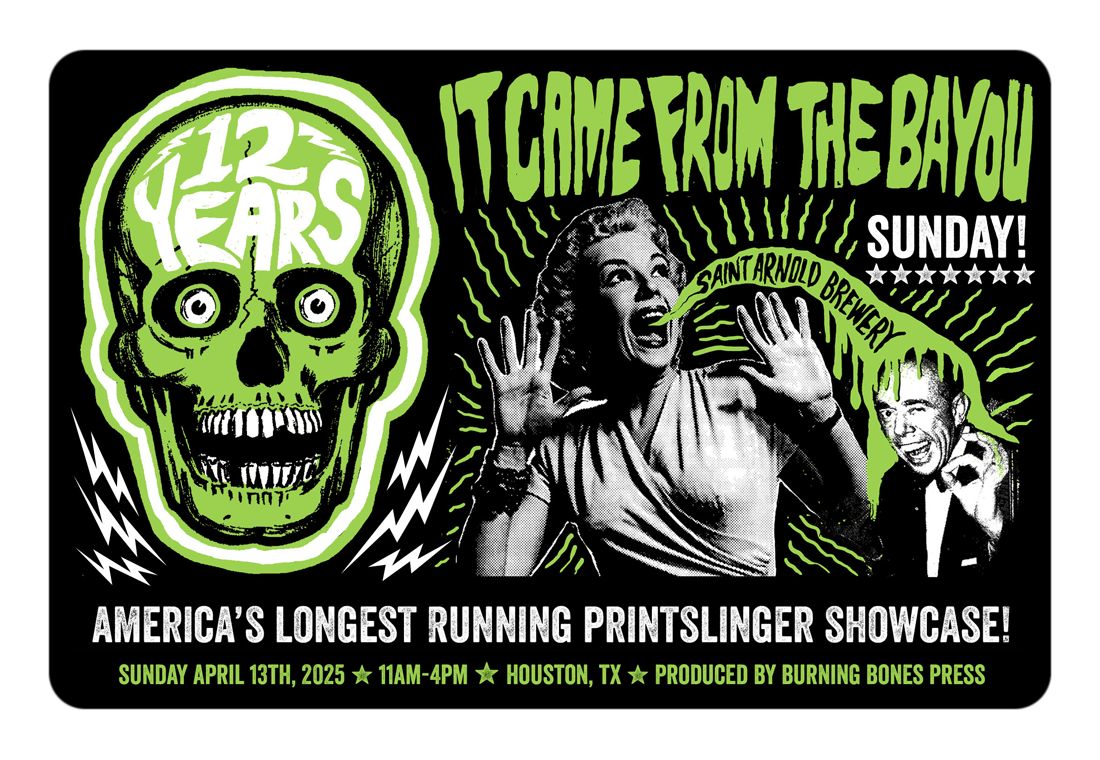 On Sunday, April 13, the Twelfth Annual "It Came From the Bayou!" printmakers showcase will invade Saint Arnold Brewing Company's upstairs Beer Hall (2000 Lyons Ave.) from 11 a.m. - 4 p.m. "It Came From The Bayou!" will offer work for sale by sought-after printmakers from across the U.S. The event is free and open to the public. Food and cold beverages from Saint Arnold will be available for purchase. Music by Felipe Galvan's Pachuco Boogie Sound System.