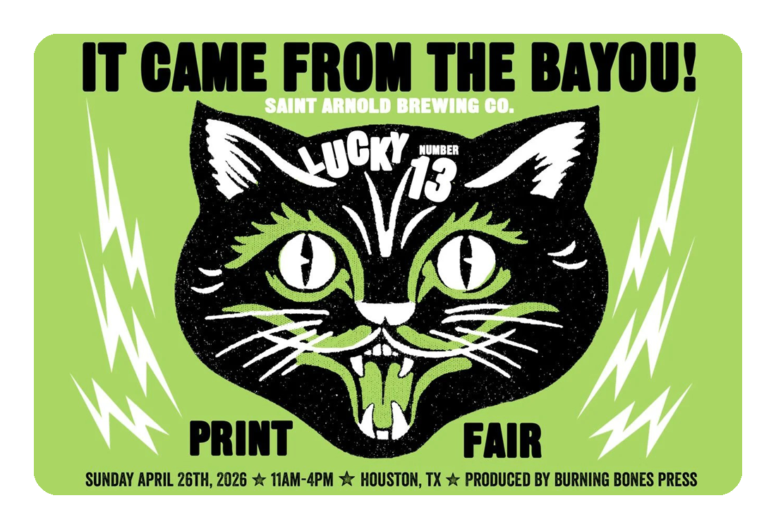 GET PRINTS! from a swampy lineup of absolutely unhinged printmakers. The ink is wet, the vibes are feral! Printmakers from across the country descend upon Houston during Burning Bones Press’ Annual 'It Came From The Bayou!' printmaker gathering at Saint Arnold Brewing Co. Showcasing work for sale by sought-after printmakers from across the U.S. This event is free and open to the public. INK. PAPER. BEER. CHAOS.